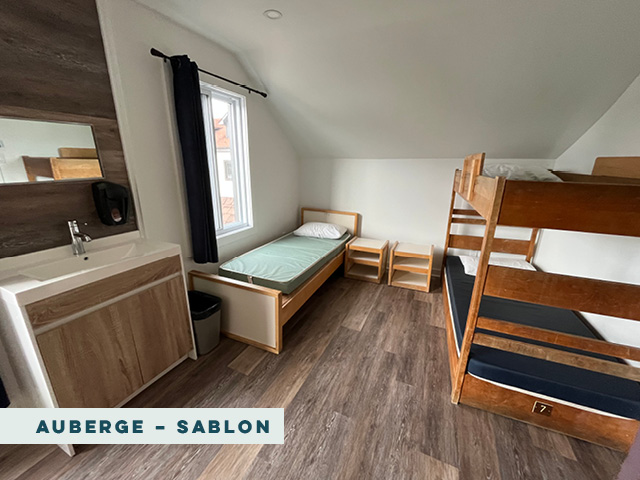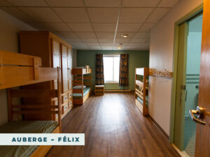 These rooms are located in the Félix wing of the Auberge. Each room sleeps 6 people in bunk beds and includes a full in-room bathroom. All Félix rooms are equipped with closets, a table and chairs. They can be heated but are not air conditioned. There are 3 lower bunks and 3 upper bunks in each room. Please note that lower bunks are close to the floor. Mattresses in these rooms are standard twin-sized camp mattresses.