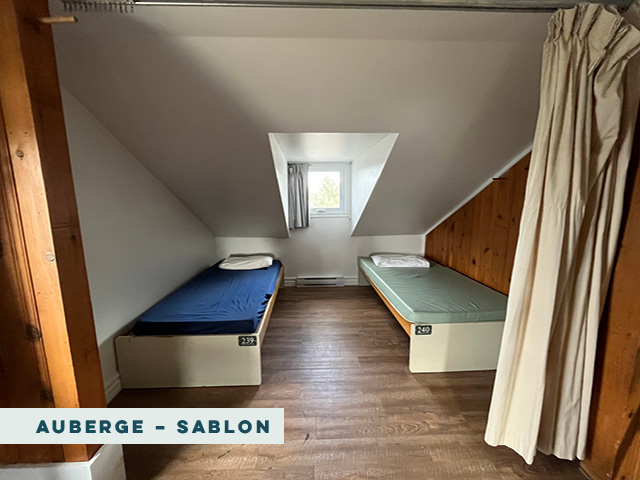 These rooms are located in the Sablon wing of the Auberge, and sleep 4-7 people per room in bunk beds with a sink in each room. These rooms can be heated but are not air conditioned. Located in the original wing of the Auberge building, these rooms have a charming rustic decor and a beautiful view of the lake. Please note that lower bunks are close to the floor. Mattresses in these rooms are standard twin-sized camp mattresses.
