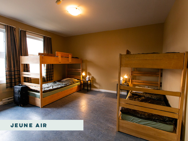 These rooms sleep 2-4 people per room in bunk beds All rooms in Jeune-Air include closets and can be heated. Some rooms also have a sink in the room. Please note that the mattresses in these rooms are standard camp mattresses. The site has ordered queen beds to be placed in rooms on this side of camp, but cannot confirm when they will be installed.